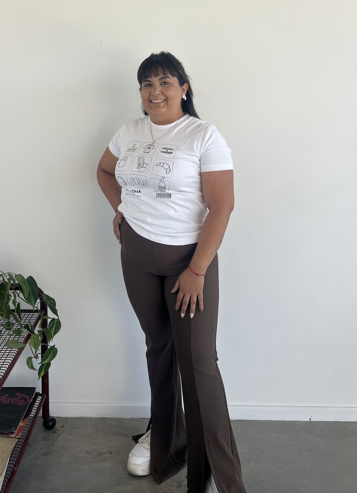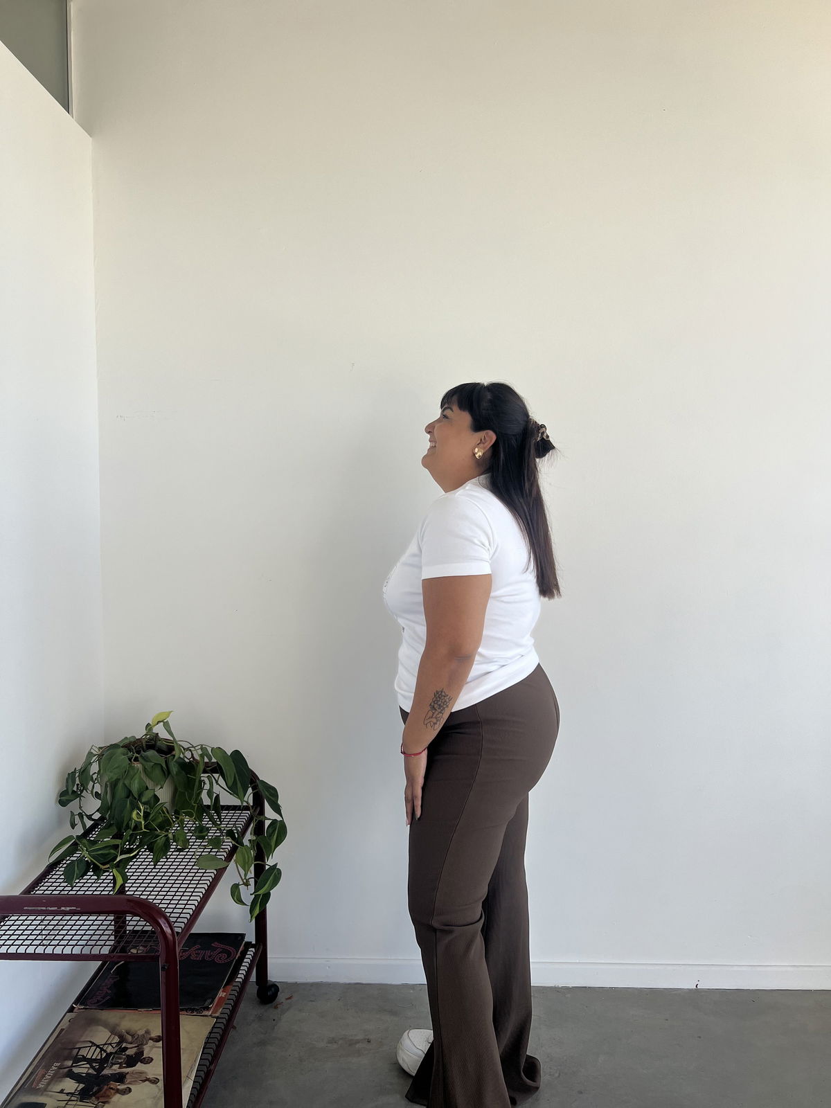 Es tiro alto con elástico en la cintura para mayor comodidad, y cuenta con un tajo en el frente inferior que aporta un detalle sutil y moderno.