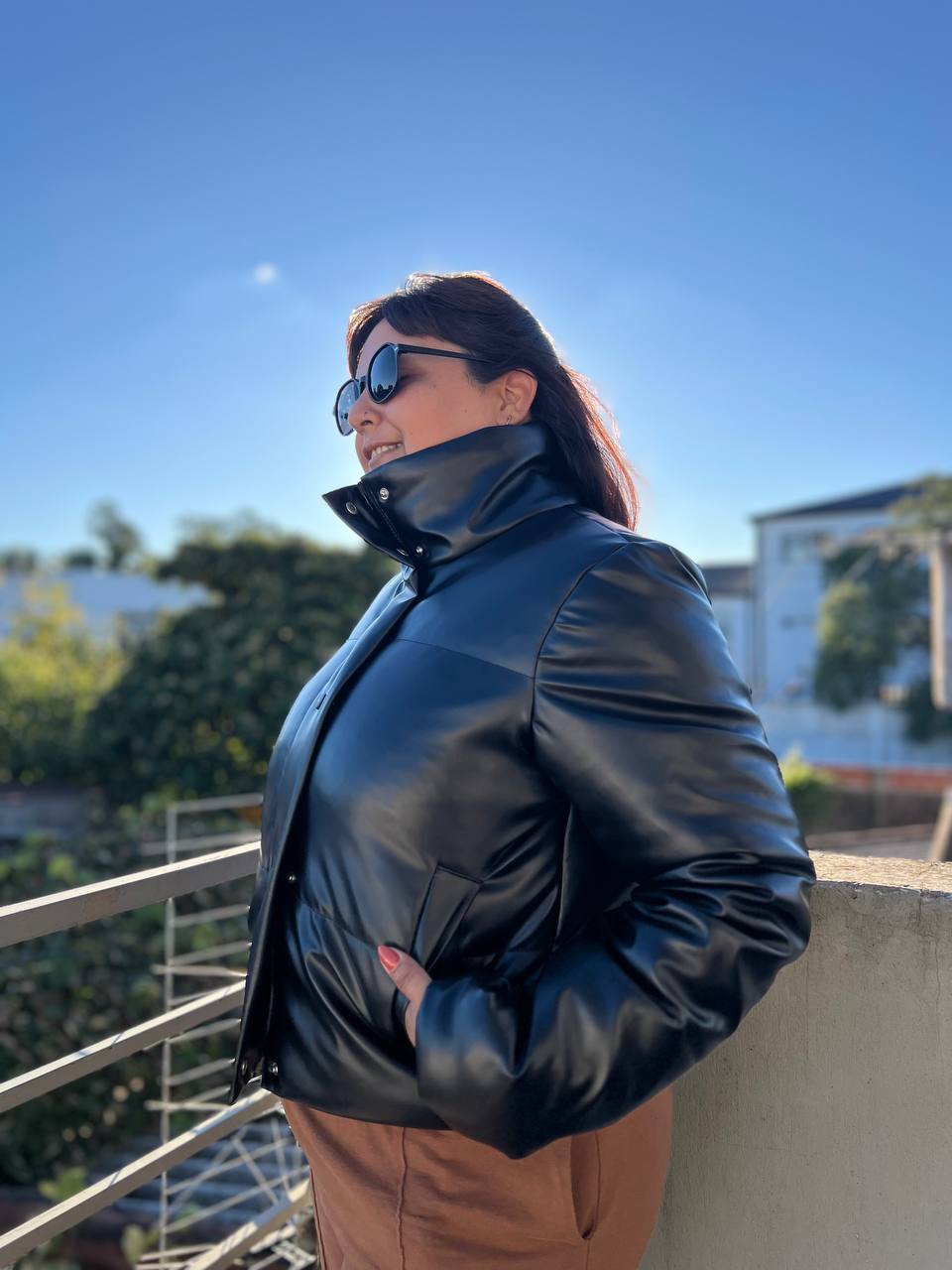 Confeccionada en ecocuero, viene forrada en su interior para mayor abrigo y comodidad. Tiene cierre y botones al tono, cuello alto que suma presencia y bolsillos funcionales para el día a día.