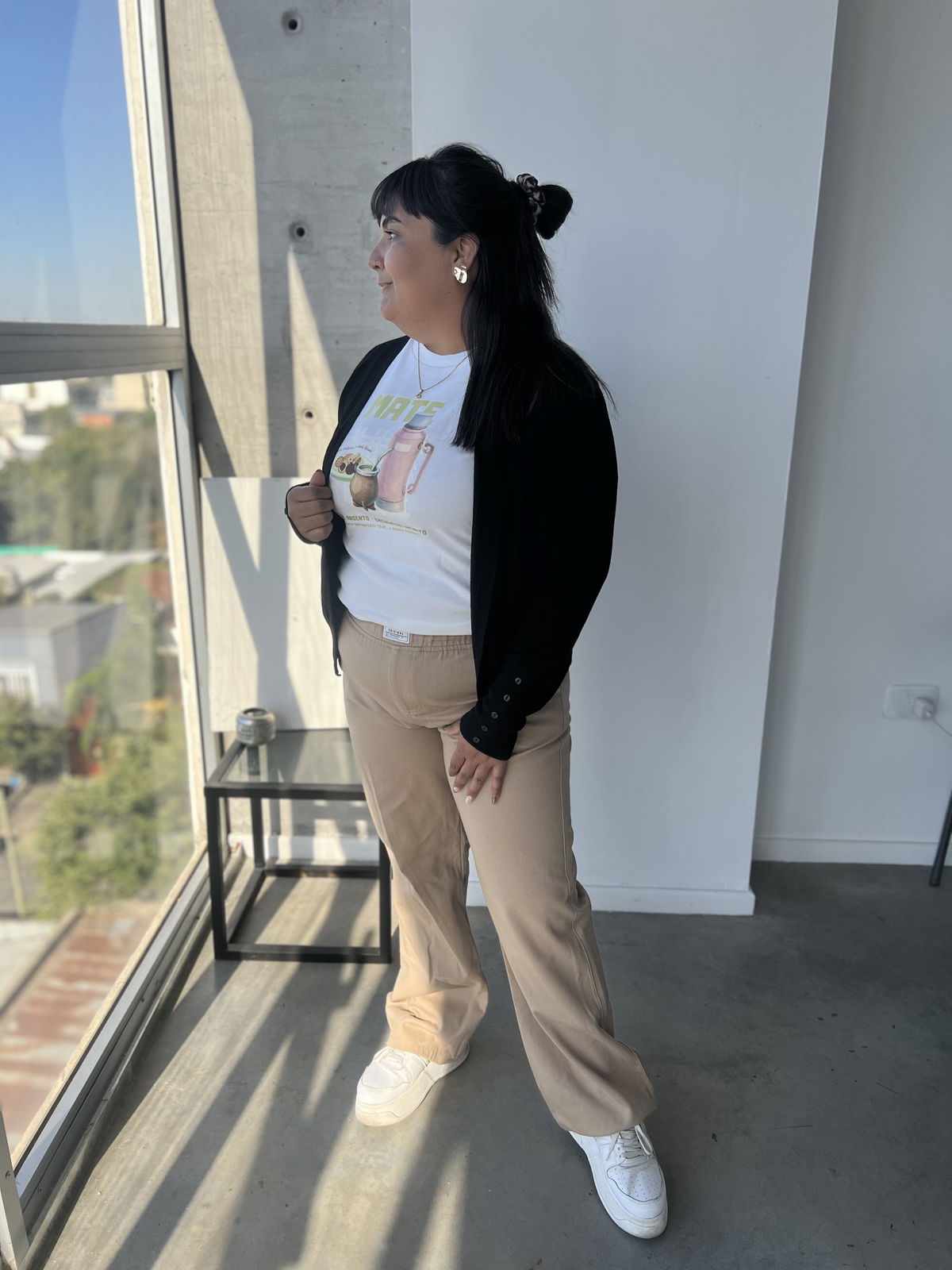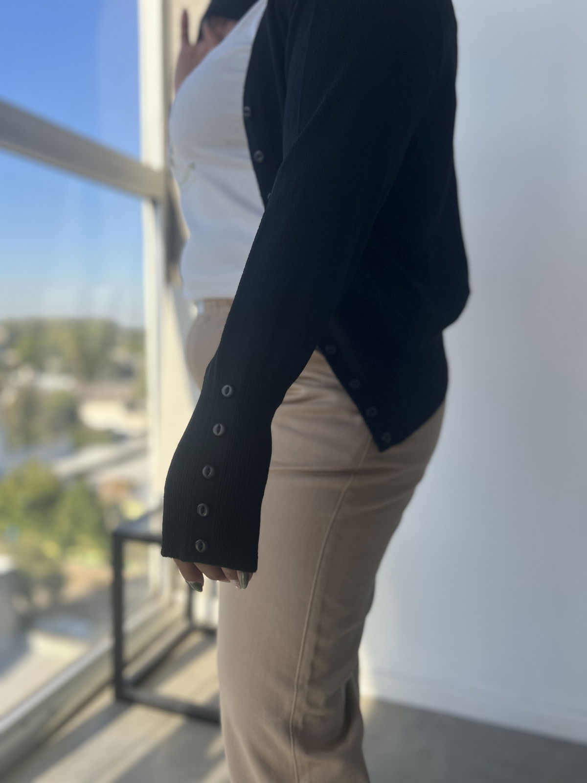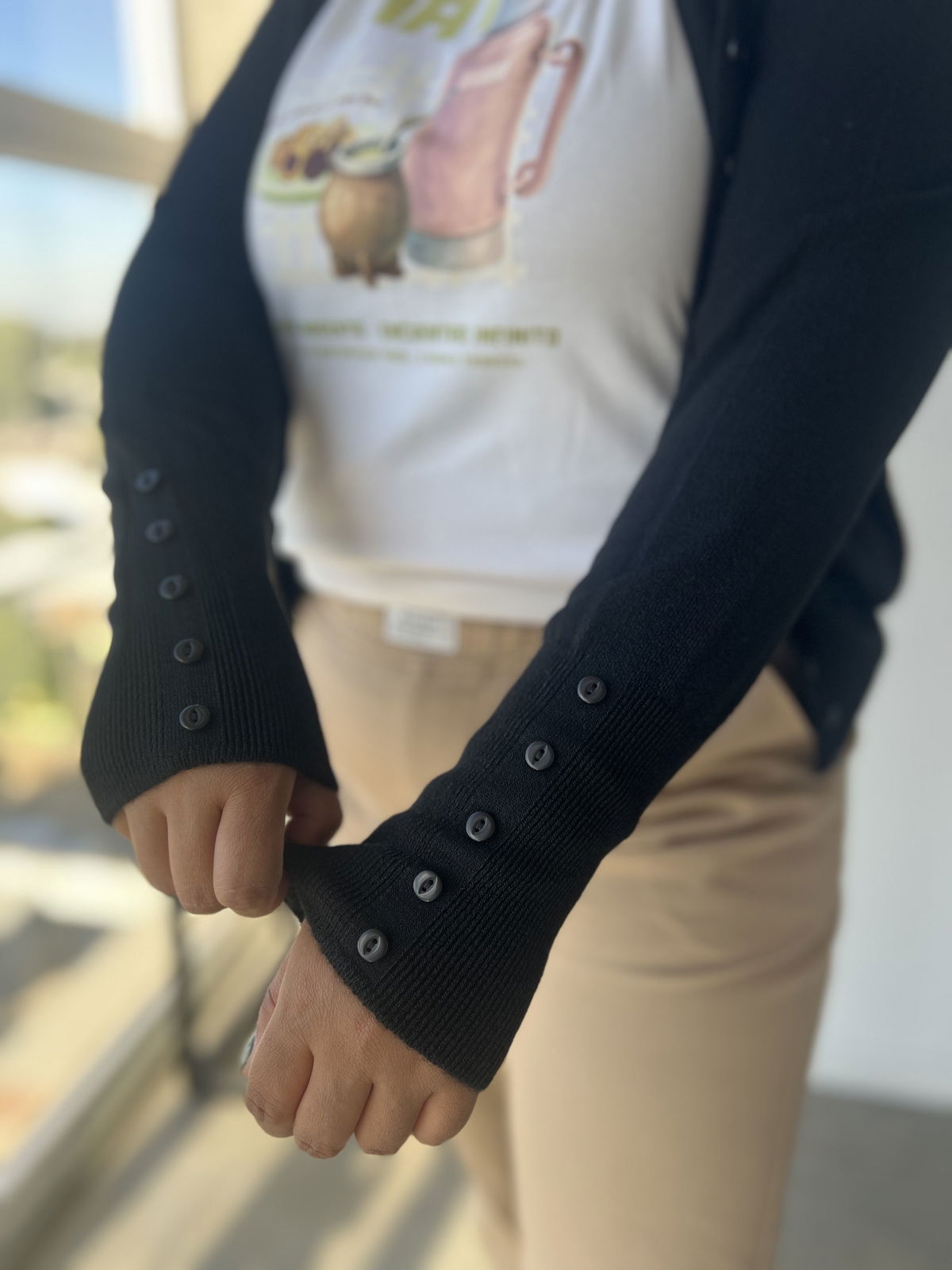 Tiene botones al tono y un detalle especial de botones en mangas que lo hacen único. Ideal para usar cerrado como sweater o abierto en capas. Puños altos. Textura suave, apta para usar sobre la piel
