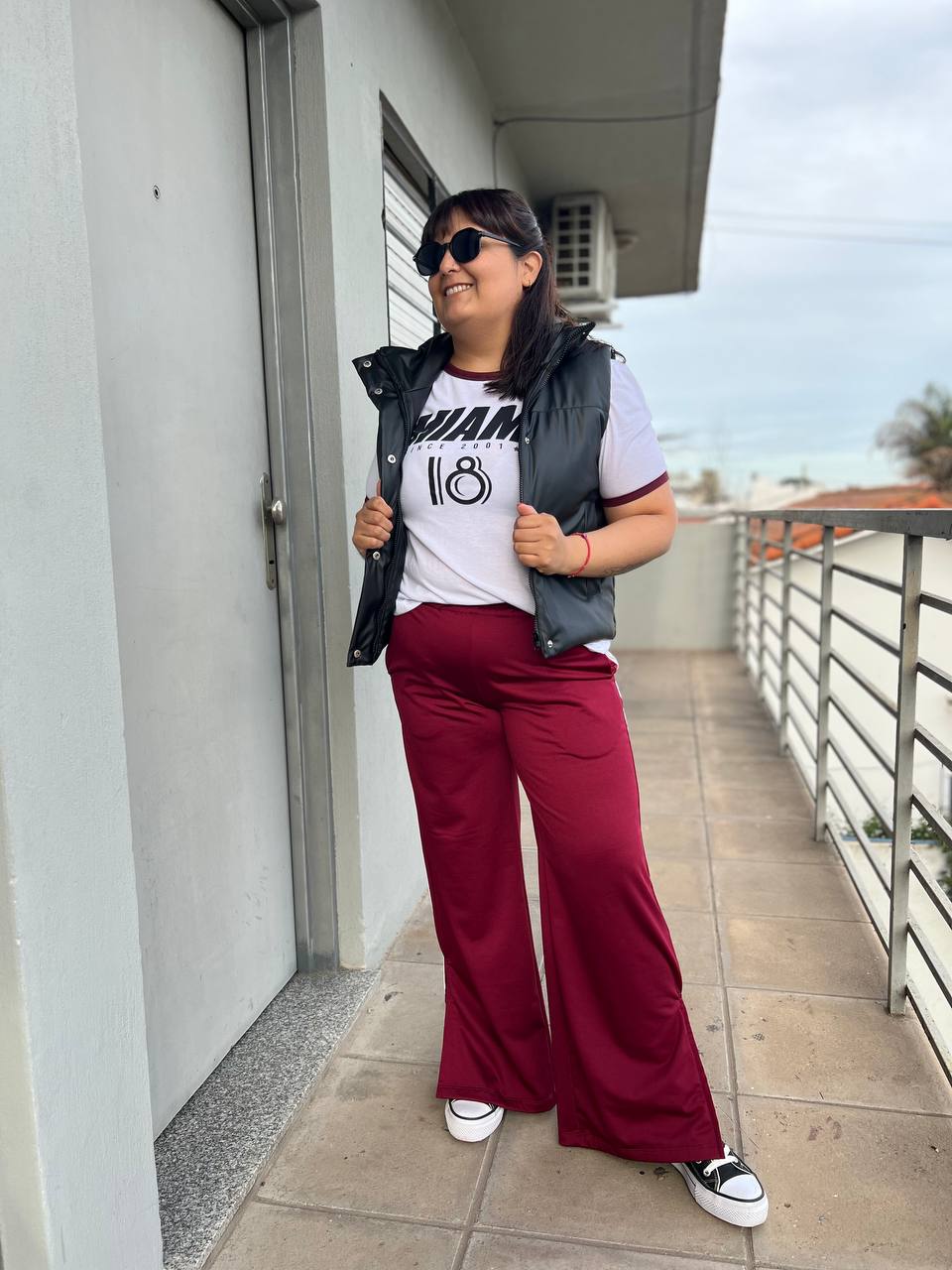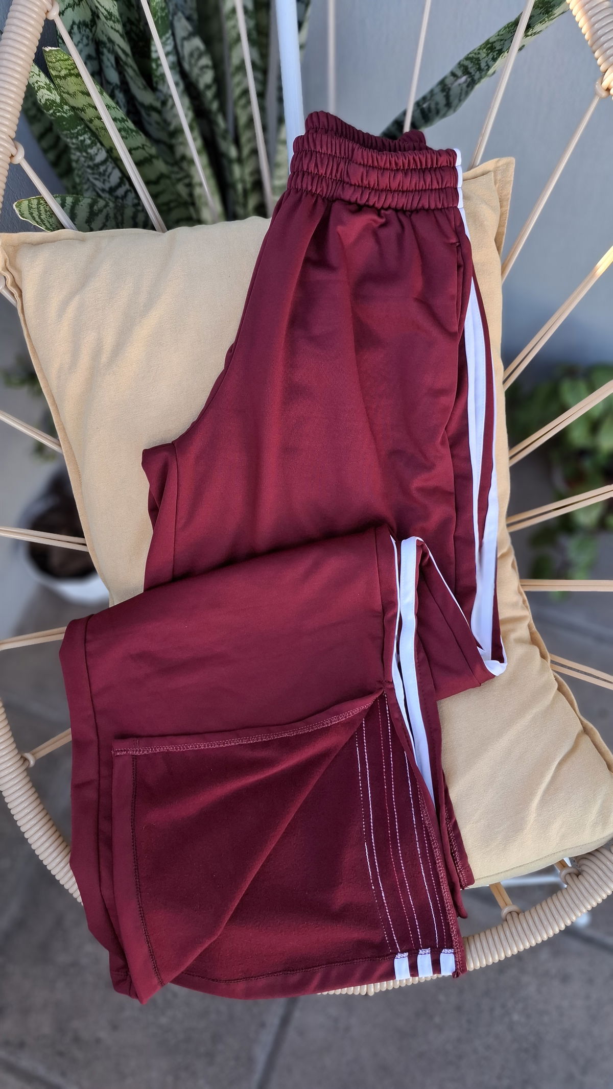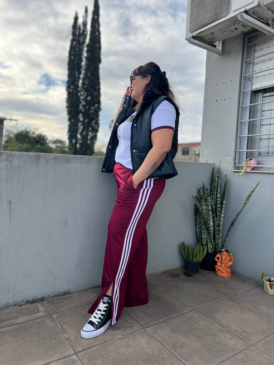 Pantalón deportivo palazzo con tajo en el final de la pierna y rayas blancas a los costados.