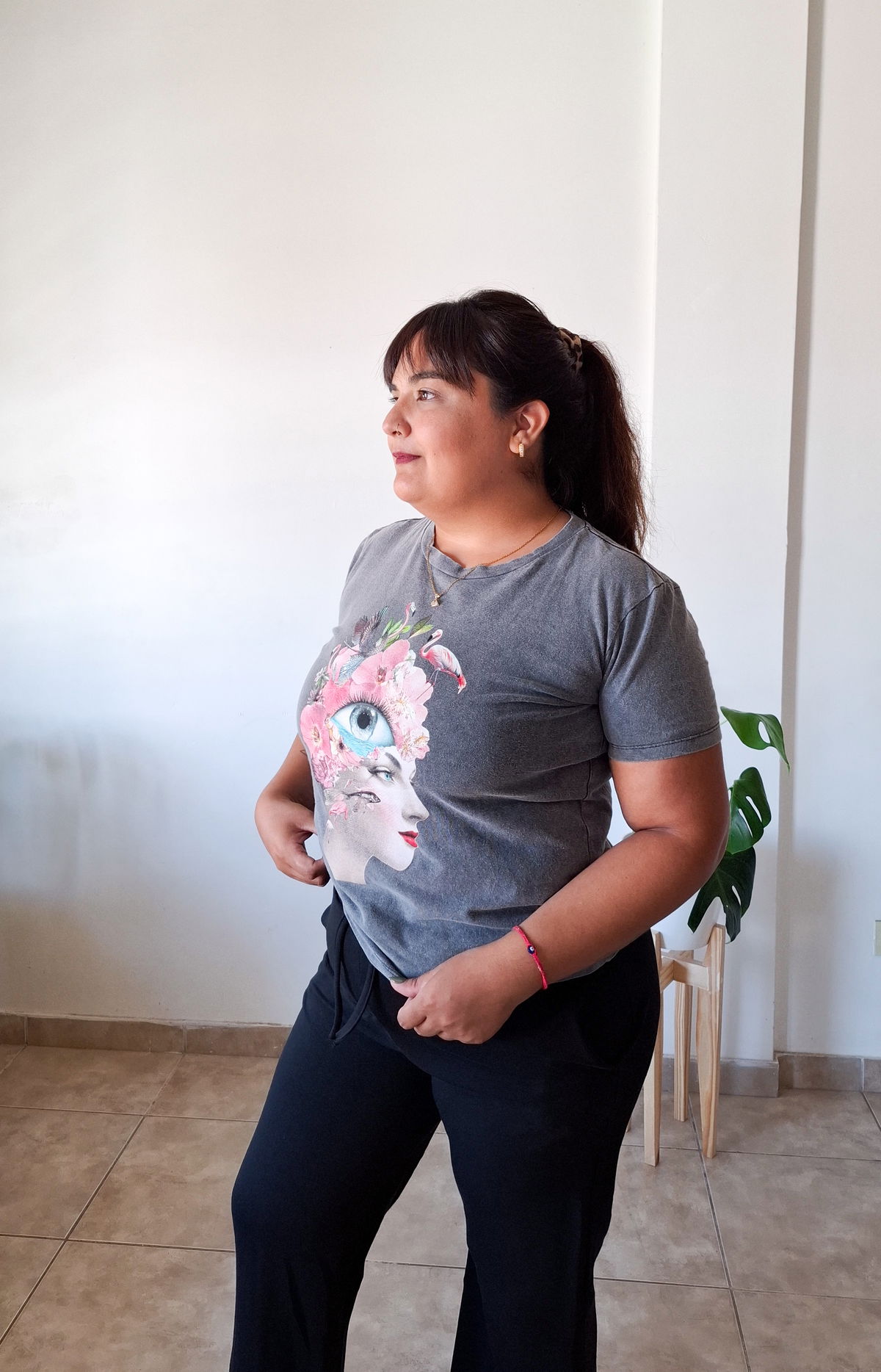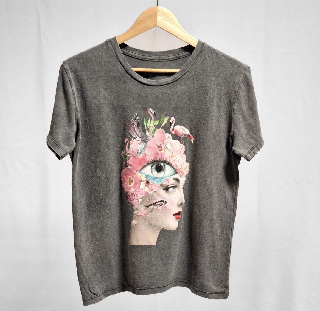 Cisne Batik pura expresion. Diseño artistico con el rostro de una mujer, flores y detalles que la convierte en una remera protagonista de cualquier look.