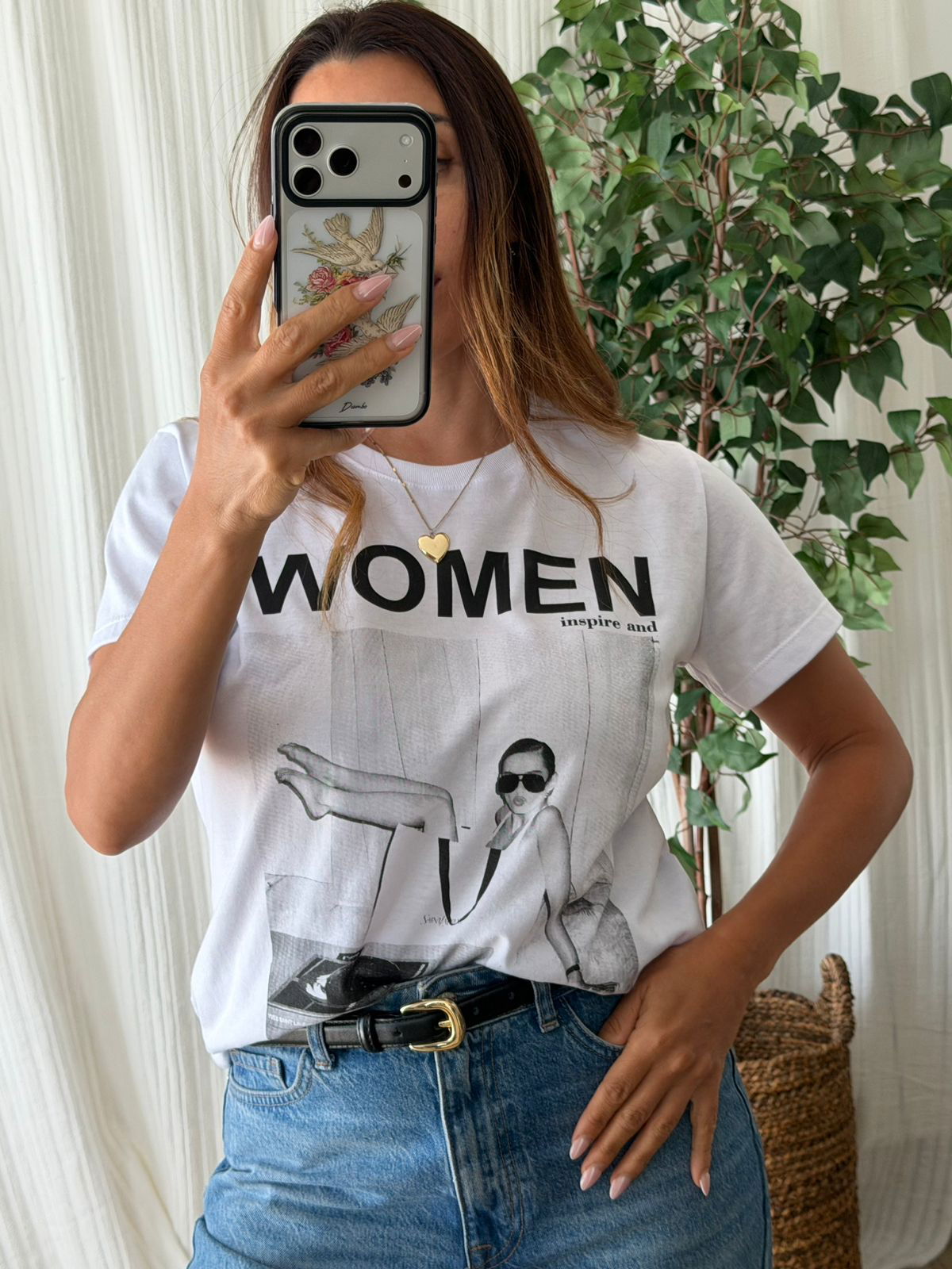 Es un modelo largo, con un calce relajado que le da mucha onda al look. En el frente tiene un estampado protagonista: una ilustración de una mujer recostada dentro de una bolsa, acompañada por la palabra “Women” en negro que le aporta fuerza y personalidad a la prenda.